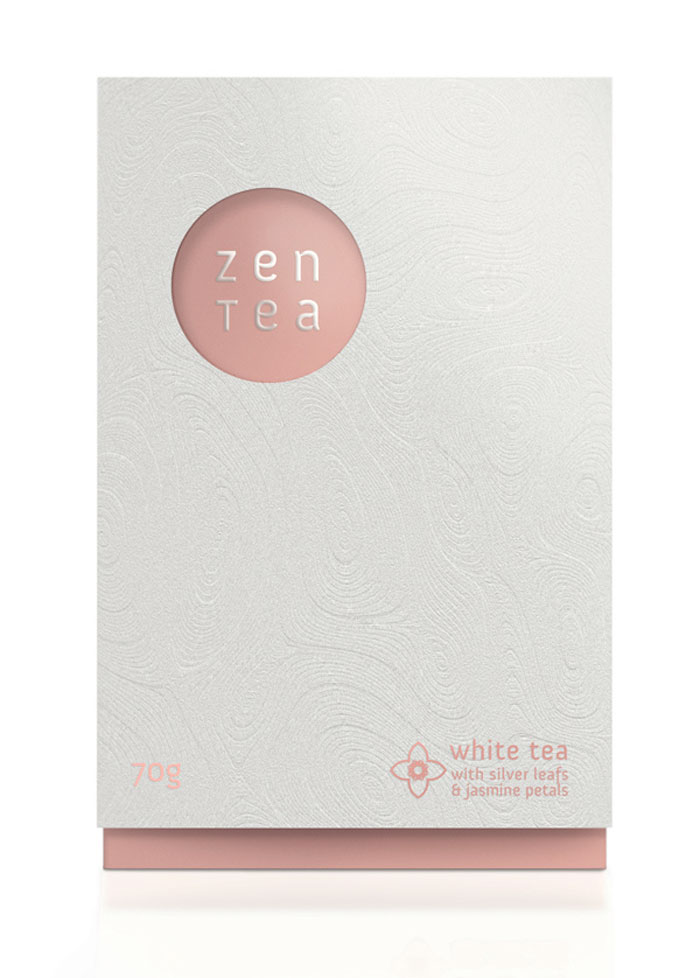 看看這美麗的茶包裝。我們喜歡在外套筒上的一個禪宗花園的微妙質地。一旦撕開它,你看到一個散熱墊模式從標志類型。色彩柔和的調色板反映了設計師想要傳達的寧靜。