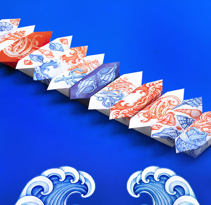 這條由伴侶工作室設計的糖果制作精美,在一個干凈的白色表面上使用華麗的紅色和藍色的插圖。圖紙是復雜的,優雅的手繪線的組合收斂。美麗的海上圖案被翻譯在外包裝上,并在個別包裝上,每一個甜蜜的折疊在一個豐富多彩的封面。